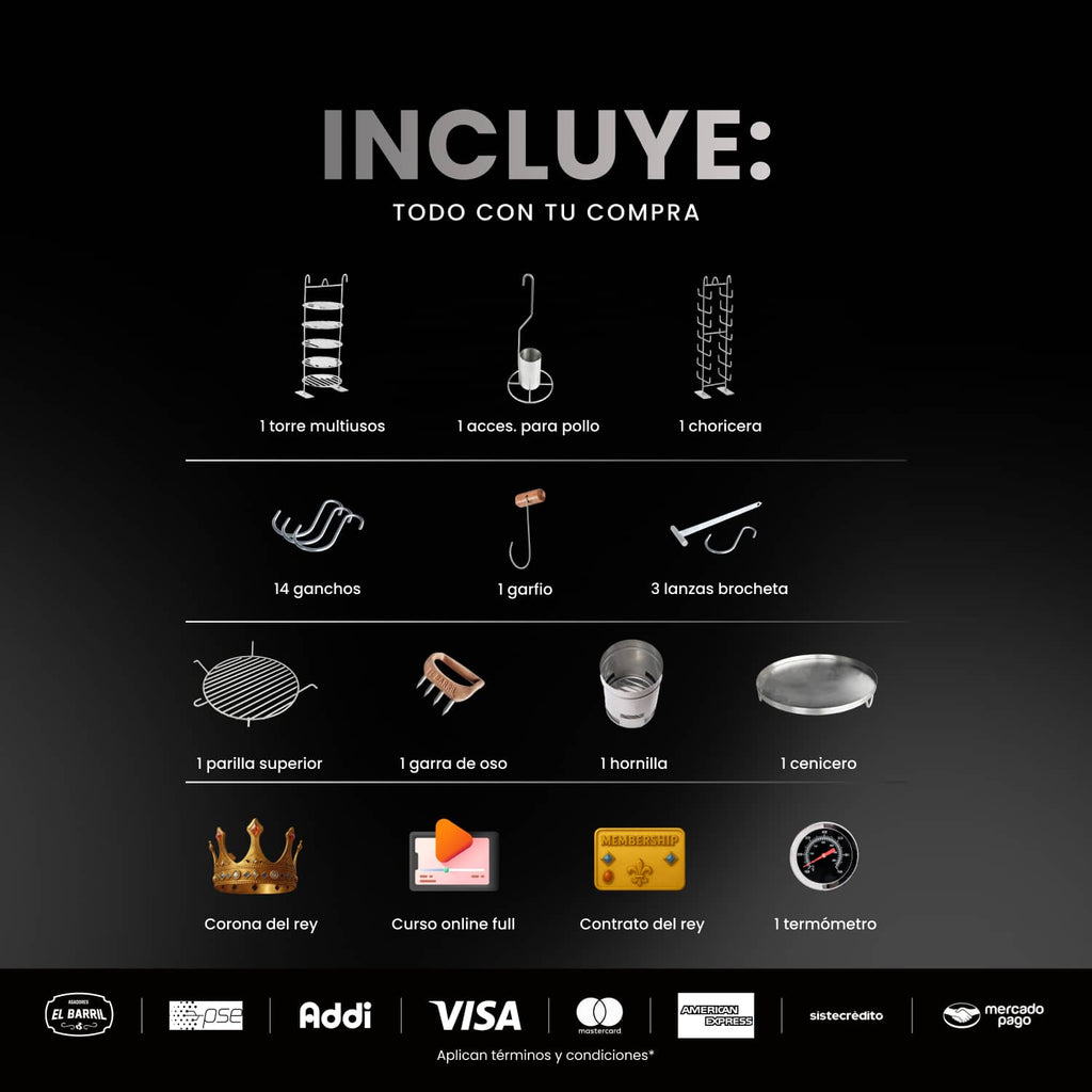 Además, este combo incluye un Curso Online Full para que aproveches al máximo tu asador y un Contrato del Rey para brindarte garantía y confianza.