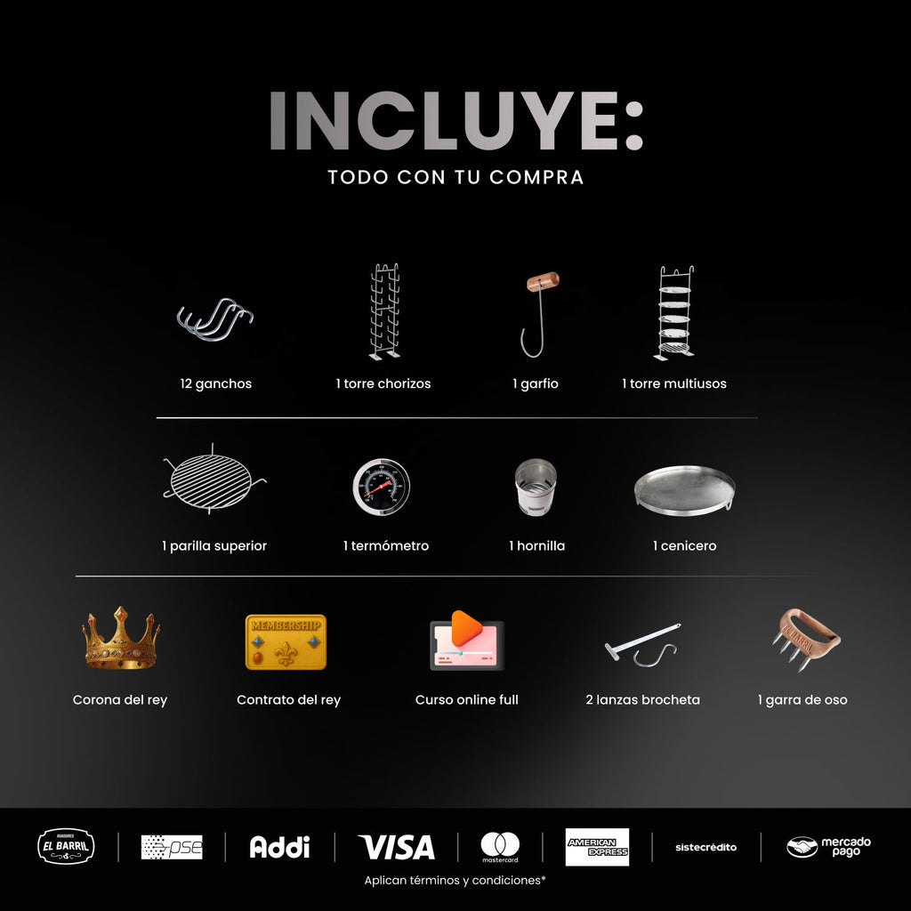 Además, este asador incluye un Curso Online Full para que puedas sacarle el máximo provecho a tu nuevo asador, y un Contrato del Rey para tu seguridad y garantía. ¡Y todo esto lo puedes obtener por solo $749,900!