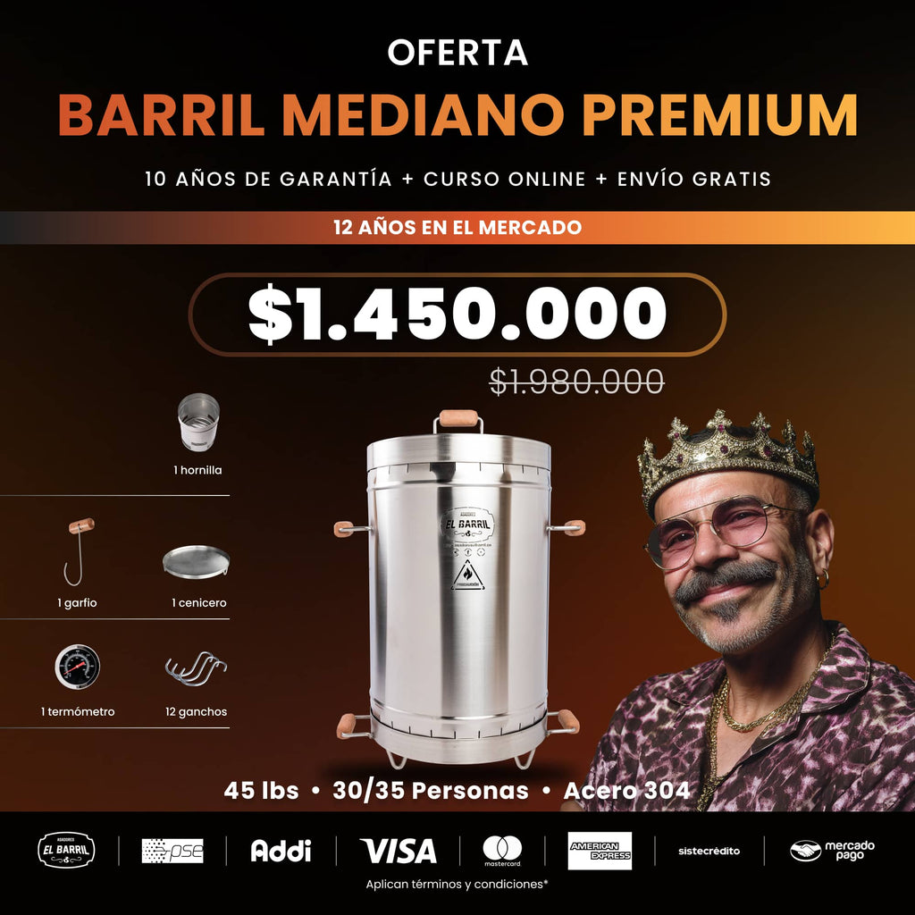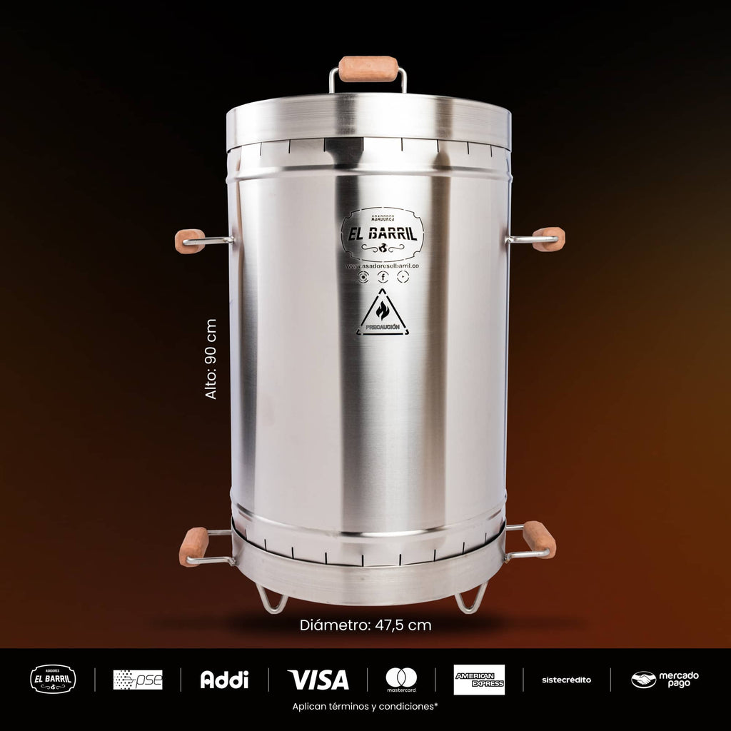 Experimenta el arte del asado tradicional con nuestro Barril Asador Mediano en Acero Inoxidable, diseñado para quienes buscan un asador eficiente y versátil. Con un diámetro de 48 cm y una altura de 90 cm, este asador es perfecto para reuniones familiares o eventos pequeños, permitiéndote cocinar entre 25 y 35 libras de carne con un sabor auténtico y una cocción impecable.
